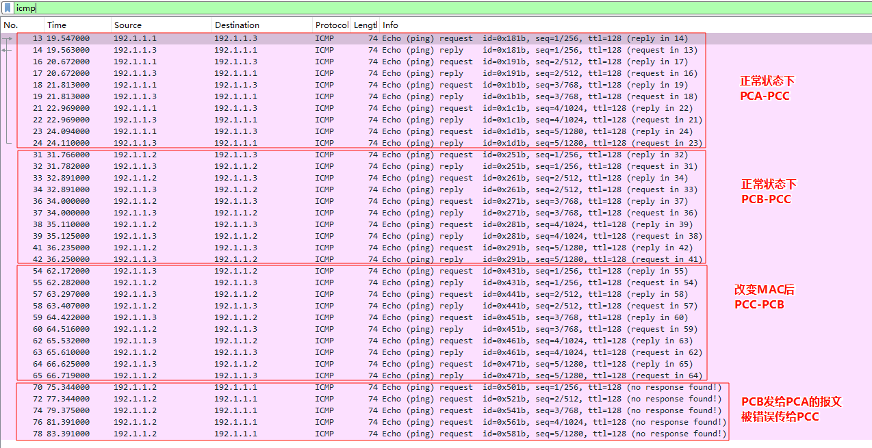 5.PCB发送ping 192.1.1.1 给PCA,从S3的2端口抓包