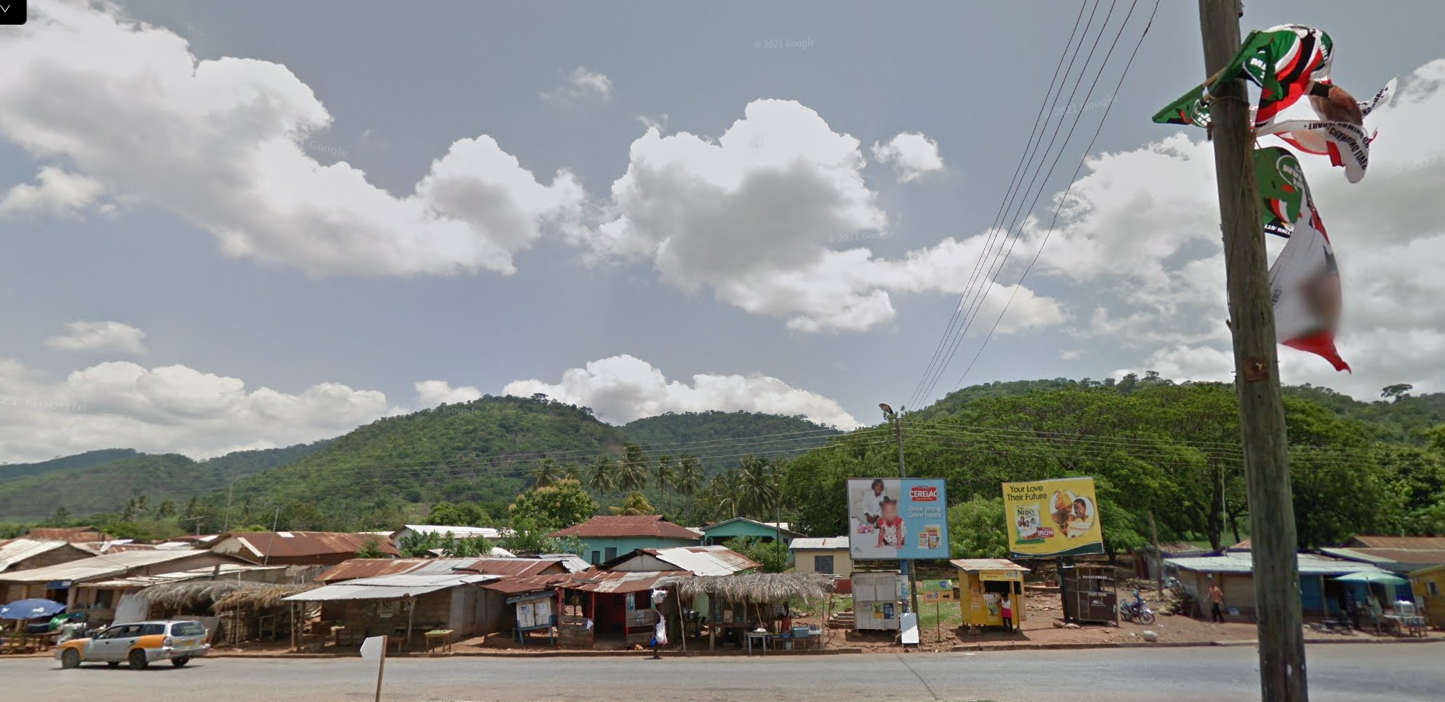 第3题:非洲易知。右行+热带植被+黄色商用车牌+出租车样式(车轮罩和四分之一车身罩板总是橙黄色的)易得加纳。环境中明显可见较高的山脉,这在该国并不多见,主要分布在Lake Volta附近;山上覆盖着的茂密森林也是该地区常见的景色。山脉大致呈南北走向,且道路紧贴其中一条山脉;另外在东边远处还能看见另一条山脉,故根据以上特征扫图,则不难在Ho城以西发现完美符合条件的地形。5k点为地图上唯一可见的大型路口。